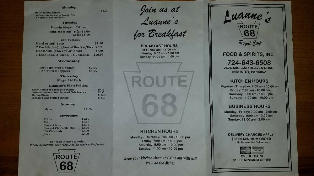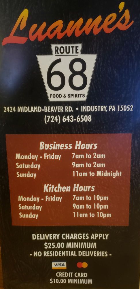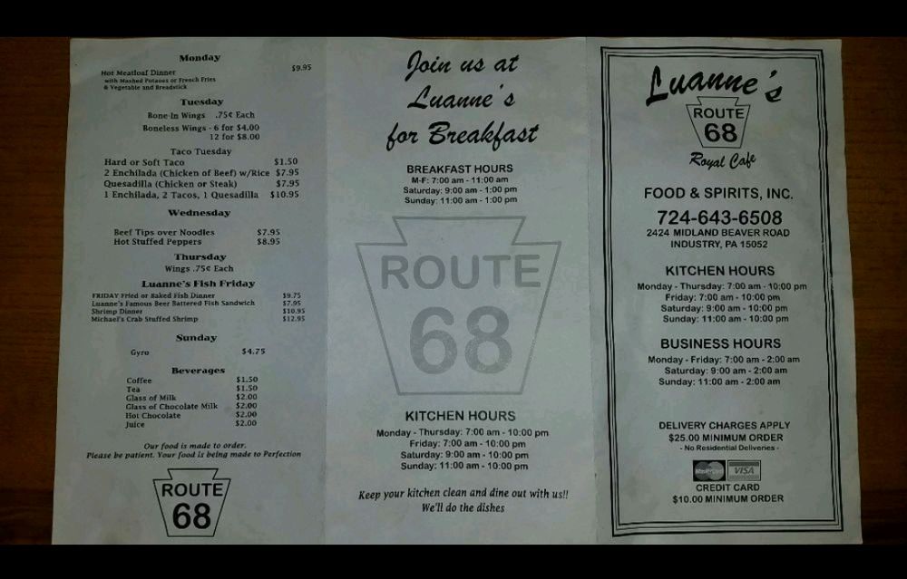 Introducing "LuAnne's Route 68 Food & Spirits," a cherished gem in Industry, PA, where American breakfast and brunch come alive. This casual dining spot is well-equipped for various preferences, with wheelchair accessibility, outdoor seating, and a full bar. Its inviting atmosphere is perfect for families and groups, making it a local favorite.